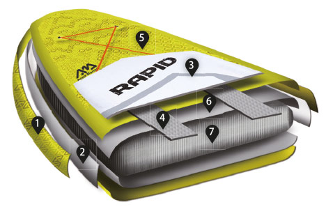 - Technologie double stringer : présente sur le paddle Aqua Marina Rapid, elle est caractérisée par l’ajout de deux bandes de stringers (lattes) sur toute la largeur du SUP lui permettant d’être plus rigide.
